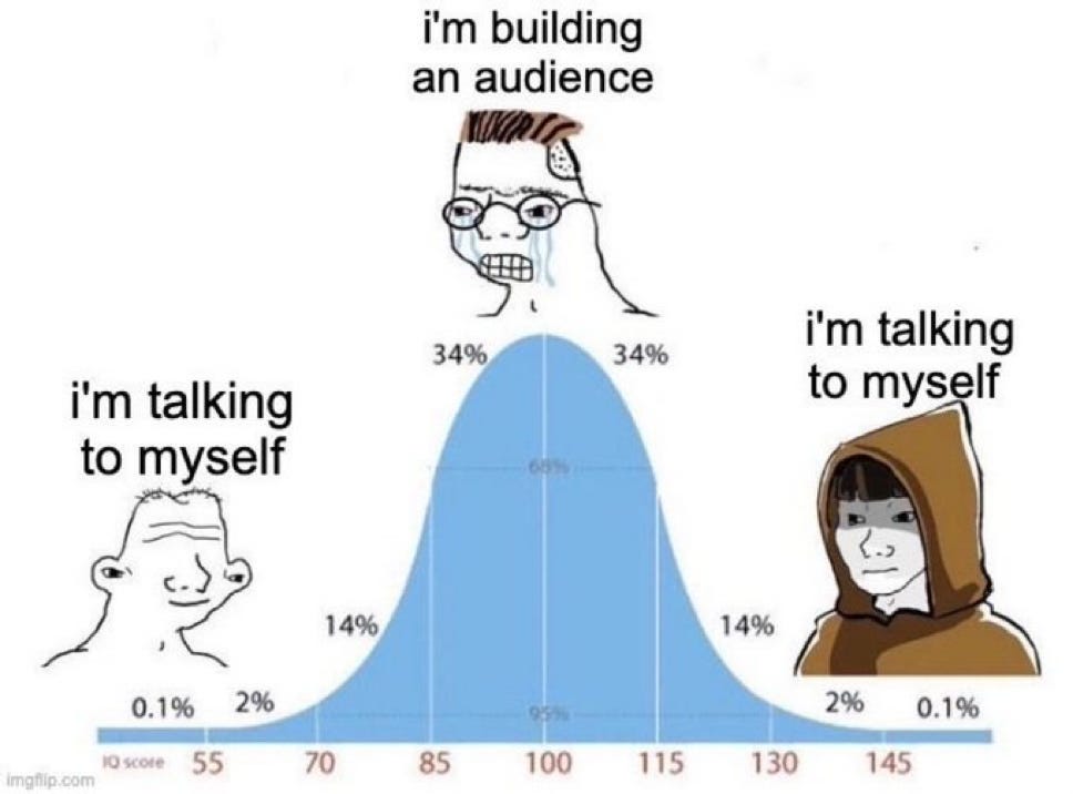 It’s my own little corner of the internet where I dump my thoughts. Not primarily for an audience, but for myself. Having it read by strangers is a side effect. (I wrote about this tension before – the midwit bell curve applies here too.)